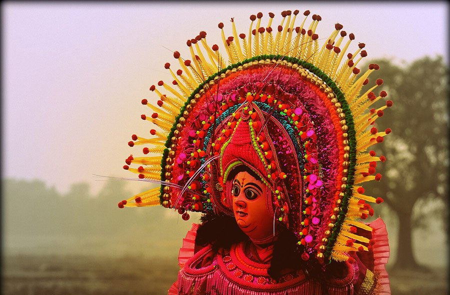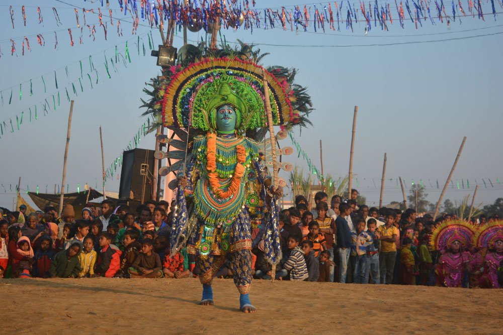 Chau dance is popular among the indigenous people of Chotonagpur Plateau region. Apart from Purulia Chau, there are two other variants – Seraikella Chau and Mayurbhanj Chau which are practised in Jharkhand and in Odisha respectively. Chau is connected to the ritual and religious celebrations of the people in these regions. Chau is most intimately associated with the Chait Parab that is celebrated in the festive spaces of local Shiva temples in Purulia around April/May every year. Initially performed by a single dancer with no mask (Ekoira Chau), Purulia Chau was influenced by other local forms of dance found at the popular local festival of Gajan. The stories enacted by Chau dancers are mainly from the epics of Ramayan, Mahabharata, Puranic texts and others. The dancers wear ornate costumes and masks elaborately crafted mask that portrays the character of the dancer.